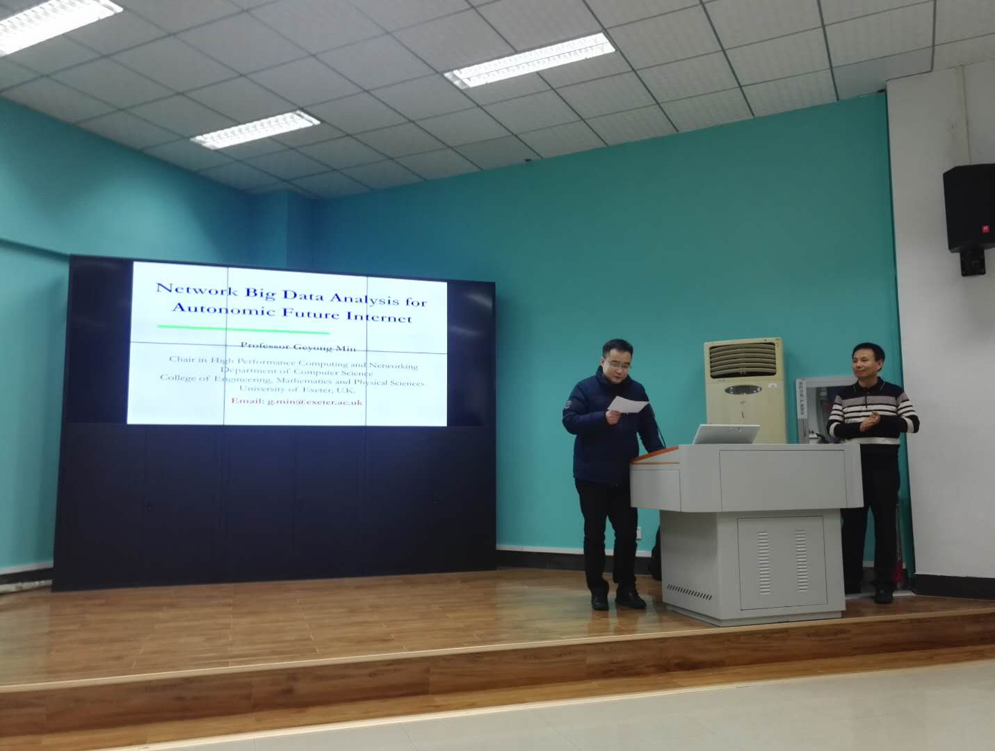 1月2日,应beat365官方网站院长王力哲教授的邀请,英国Exeter大学(计算机学科首席教授)闵革勇教授来院访问,并做了题为“Network Big Data Analysis for Future Intelligent Internet”的学术报告。闵革勇教授在计算机/通信学科的IEEE与ACM国际顶级期刊上发表学术论文140余篇,多次获得会议最佳论文奖,现任6个国际期刊的编委(含计算机学科顶级国际期刊IEEE Transactions on Computers),18个国际期刊专刊的编辑,先后担任了18个国际会议/研讨会的大会主席和程序委员会主席,80多个国际学术会议的程序委员会委员,并在多个国际学术会议与研讨会上做大会特邀主题报告。学术报告在王力哲教授的郑重介绍下正式开始。