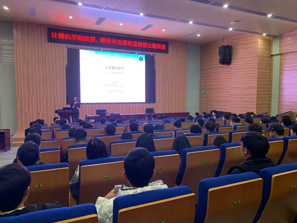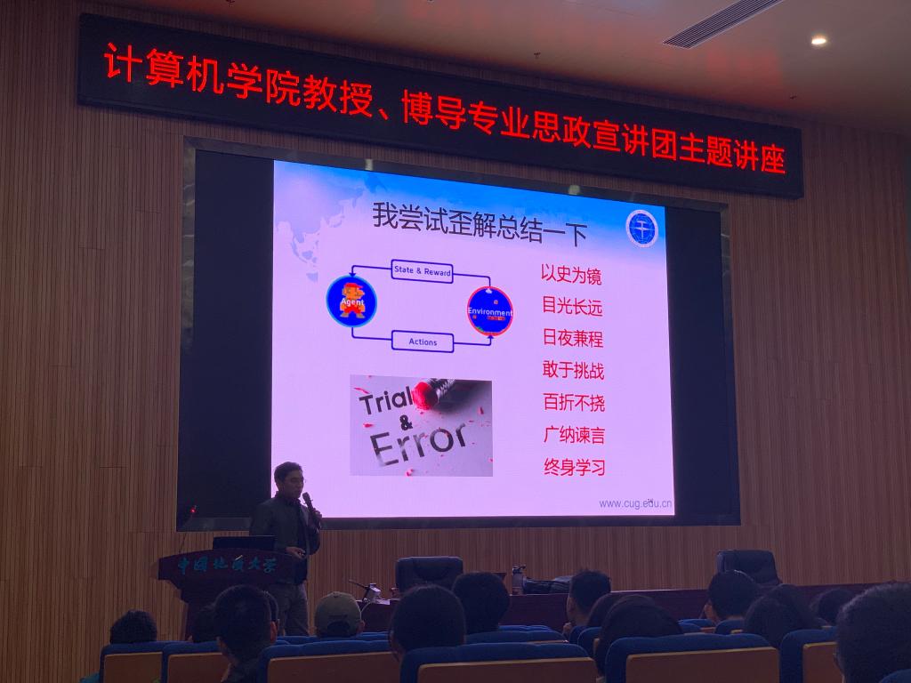 讲座正式开始,曾德泽教授以自己的研究领域,强化学习算法为例,深入浅出地介绍了强化学习的基本原理和步骤,并由此引申出“人生强化学习”的主题。接着,他类比强化学习的求解过程,将个人成长过程中所需具备的品质和素养总结为28个字:以史为镜、目光长远、日夜兼程、敢于挑战、百折不挠、广纳谏言、终身学习,并通过一个个生动的实例,逐一解读其中蕴含的人生哲理,以及对同学们个人发展和进步的现实意义。通过本次讲座,同学们在拓宽学术科研视野的同时,也对“人生强化学习”这一主题的思想内涵有了更加深刻的理解和思考。