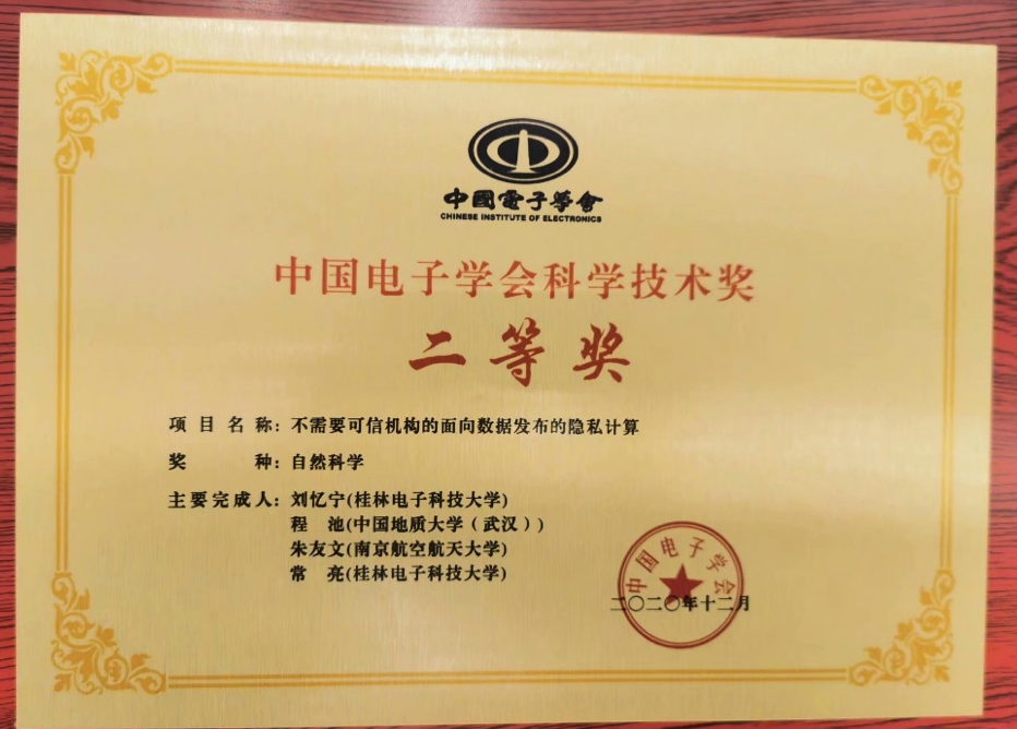 (通讯员:章丽平)2021年4月17-18日,中国电子学会2020年度科学技术奖励大会在重庆举行。beat365官方网站信息安全系程池老师与桂林电子科技大学、南京航空航天大学的学者共同完成的“不需要可信机构的面向数据发布的隐私计算”荣获2020年度中国电子学会科学技术奖自然科学二等奖。郝跃院士、刘明院士等23位院士出席大会并颁奖。