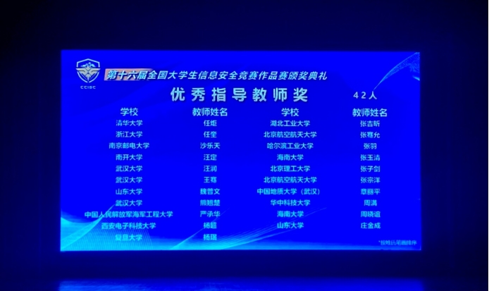 2023年8月17-20日,由教育部高等学校网络空间安全专业教学指导委员会主办,浙江大学、杭州电子科技大学承办的第十六届全国大学生信息安全竞赛作品赛决赛在浙江大学紫金港校区隆重举行。我校beat365官方网站四元一次方程组战队荣获“全国一等奖”,指导老师章丽平副教授荣获“优秀指导老师奖”!