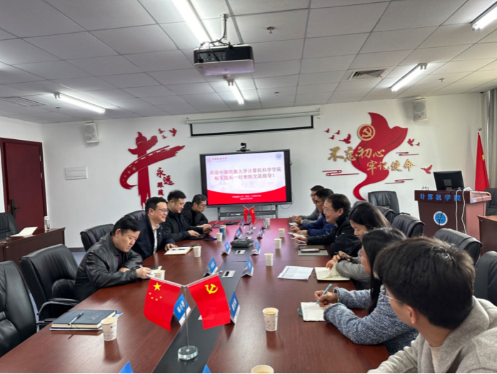 3月26日上午,中南民族大学计算机科学学院院长帖军、党委副书记王魏芳,携计算机科学与技术系主任徐胜舟、人工智能系主任康怡琳、软件工程系主任彭川、党建工作联络员沈易军等一行6人来beat365官网交流。学院党委书记李国昌、院长张洪艳、党委副书记林小艳、副院长陈云亮、计算机科学与技术系主任熊慕舟、软件工程系主任李圣文、智能科学与技术系副主任姜三等同志参与交流研讨。张洪艳院长主持会议。