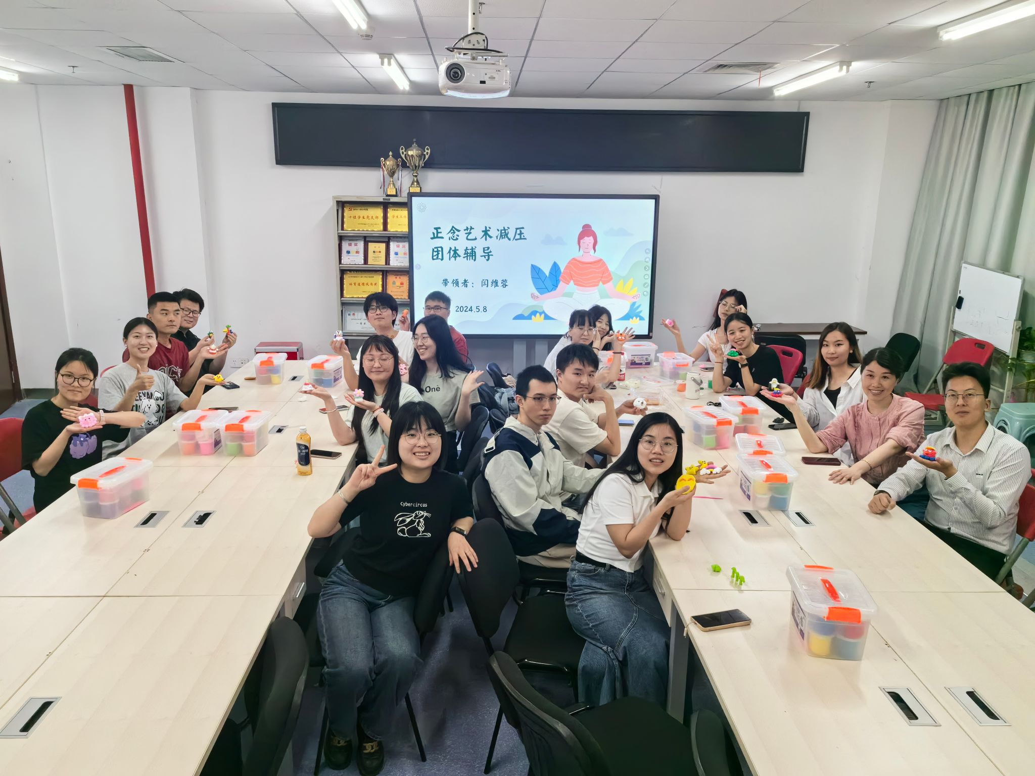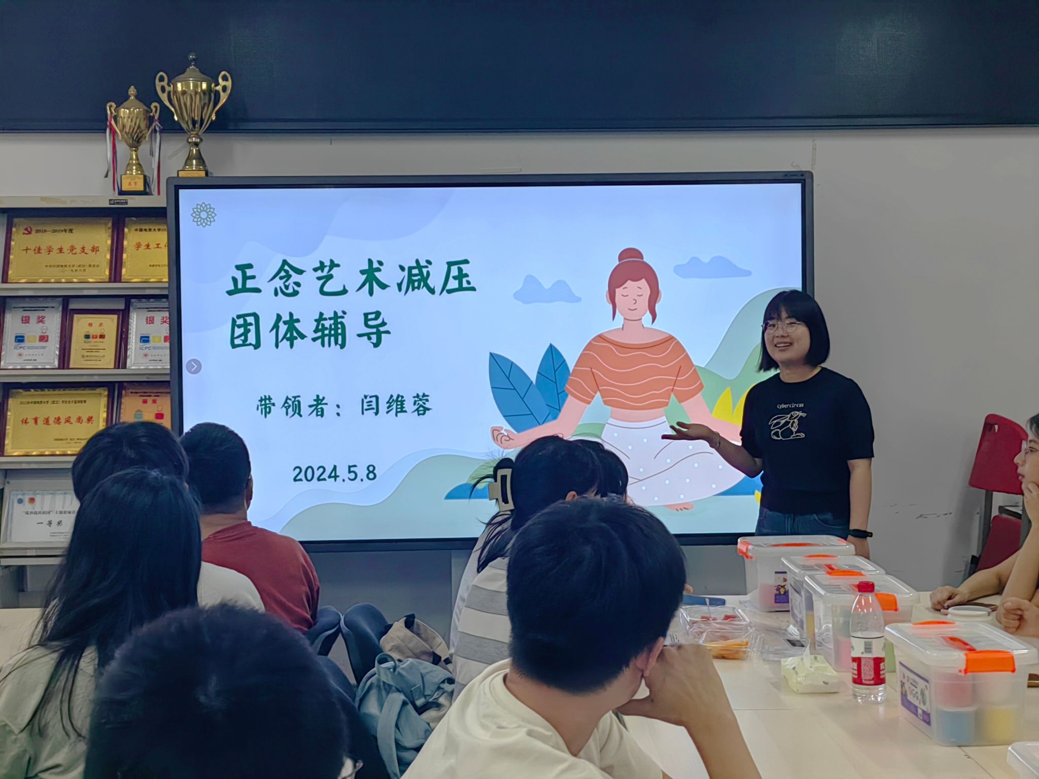 在5·25全国大学生心理健康日来临之际,为丰富学院心理健康教育活动,引导学生关注和呵护自身的身心健康,缓解工作学习带来的压力和紧张焦虑情绪,5月8日晚上,由beat365官方网站E心为你二级心理辅导站举办的5·25心理健康月系列活动之正念艺术减压团体辅导在beat365官方网站大楼101举行。学院党委副书记林小艳和20余名师生参与本次活动,活动由学院心理健康辅导员闫维蓉带领。