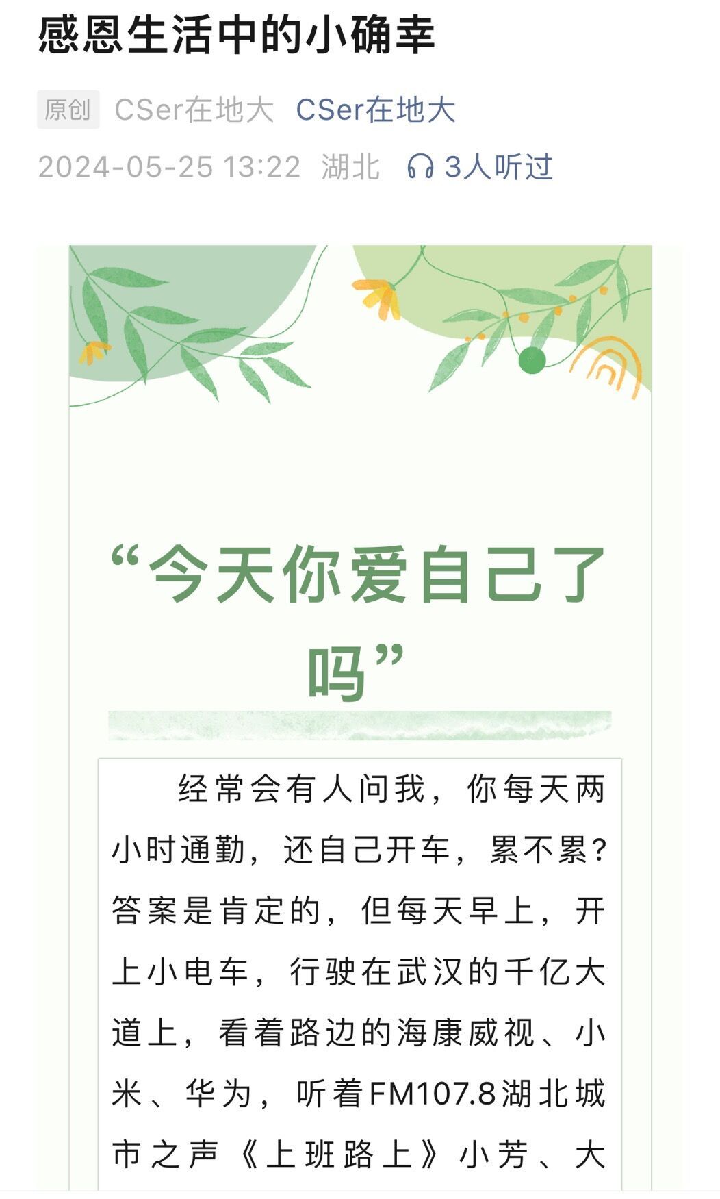 5·25全国大学生心理健康日当天,学院官方公众号“CSer在地大”发布了《感恩生活中的小确幸》,学工组全体老师为同学们送上祝福与期许,鼓励大家在生活中发现爱、感受爱、传递爱,学会享受生活中的小确幸,也祝愿CSer能在beat365官方网站感受到更多细碎而确切的幸福。