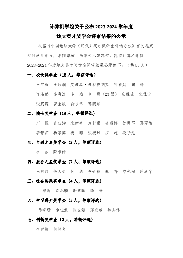 beat365官方网站关于公布2023-2024学年度地大英才奖学金评审结果的公示
