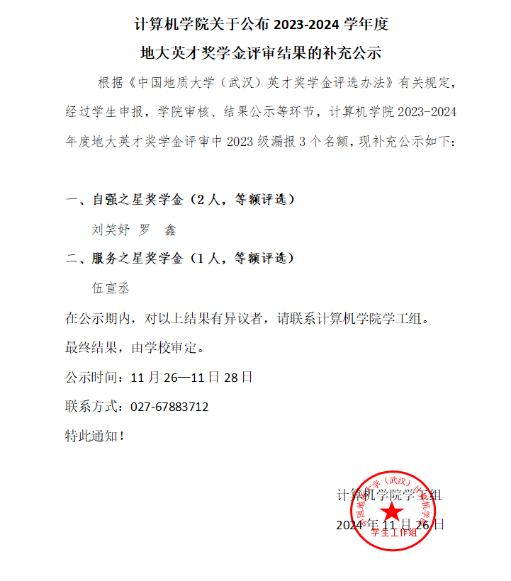 beat365官方网站关于公布 2023-2024 学年度地大英才奖学金评审结果的补充公示