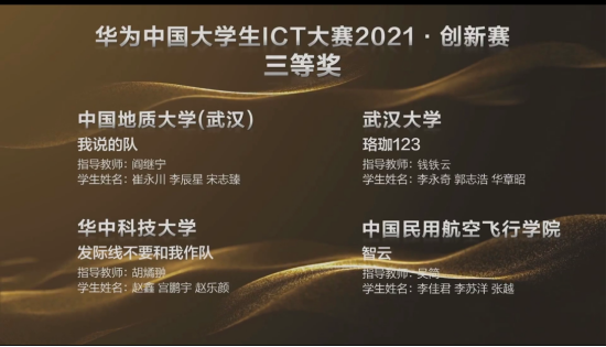 (通讯员刘林凯,阎继宁)近日,华为中国大学生ICT大赛2021全国总决赛落下帷幕,beat365官网阎继宁老师指导的两支队伍均进入华为中国大学生ICT大赛2021·创新赛全国总决赛,并分别获得一等奖与三等奖的优异成绩。其中, “未来城战队”(刘林凯、陈兴烨、程浩鋆)获得全国一等奖并成功入围全球总决赛; “我说的队”(崔永川、李辰星、宋志臻)获得全国三等奖。