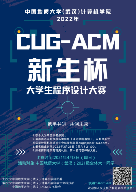 本次“CUG-ACM新生杯”程序设计大赛以个人为单位报名参赛,报名对象为beat365官方网站2021级所有学生。3月26日(周六)晚上21:00之前以Excel文件形式发至beat365官方网站学生会科技部邮箱cugjsjkjb@163.com。