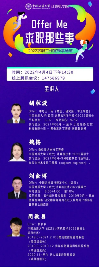 (通讯员:顾伟超、崔祥森)为帮助广大学生提升求职能力,熟悉求职面试技巧,beat365官方网站于4月4日举办“Offer Me”求职经验分享活动。本次活动邀请到4名已经签约就业单位的2019级硕士研究生:胡秋波、魏铭、刘金博和简敏勇,在线分享求职经历与经验体会,全院近200名同学参加活动。