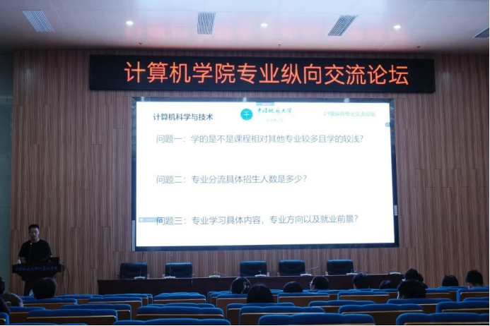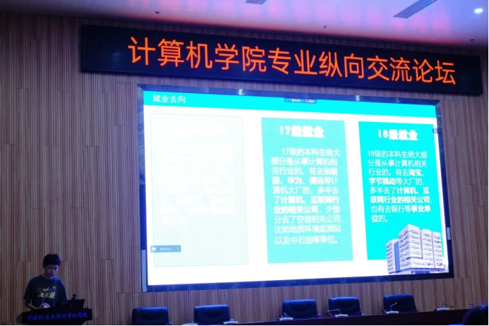 会议伊始,唐铨泽介绍计算机大类专业分流是按照个人意愿和成绩分流到学院各专业,旨在培养学生开拓性的发展,尊重学生的个性、兴趣、特长和学习自主权,激发学生主体创造性,列举计算机大类分流的注意事项,随后各专业优秀学生代表依次对专业情况进行介绍。