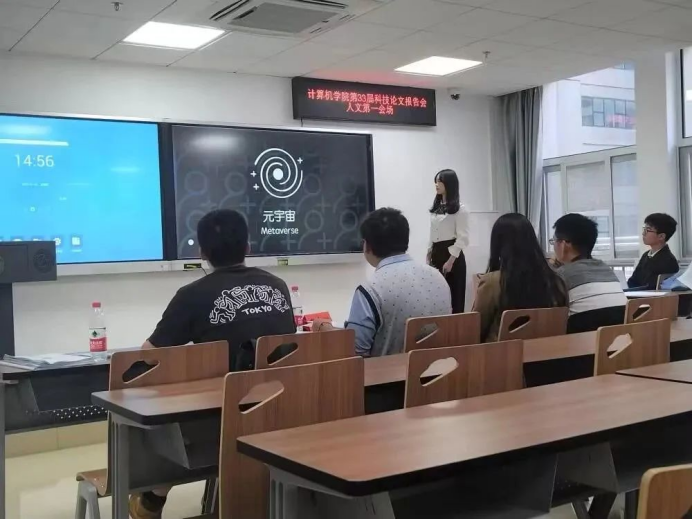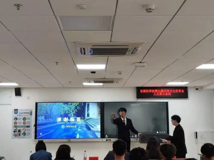 人文会场于南望山校区东区B座教学楼举行,有四个分会场,共46支队伍参赛。他们以深入浅出的方式阐述论文报告,内容丰富充实,主题涵盖广泛。其中郭婷婷团队《浅谈人工智能在日常生活中的应用及未来发展》和陶源团队《步入AI时代:浪潮冲击下人工市场现状调研与相关问题的对策分析》等从不同的角度分析了人工智能的便利和在生活、医疗、军事等不同领域中的应用。鲁烨冉团队《后疫情时代BI应用趋势分析》从近年来具代表性的电子商务平台发展方向出发,根据新的后疫情时代特征,通过多层次的实地调研推测未来电子商务平台开发趋势,与此同时极具创新性的双问卷调研方式和数据、词频分析方式获得评委老师的一致好评。