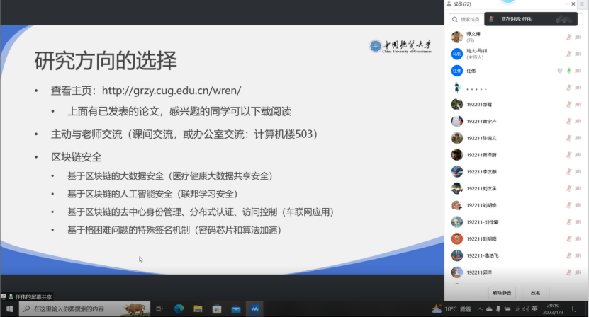 2023年1月9日晚,为了让同学们尽快熟悉信息安全专业情况,融入到信安大家庭,beat365官方网站信息安全专业2021级师生新春见面会暨“1111”人才培养计划发布会通过腾讯会议在线上顺利举办。beat365官方网站党委副书记傅苑、beat365官方网站信息安全系全体教师、beat365官方网站信息安全专业2021级全体同学和2021级辅导员谭文博参加本次会议,会议由信息安全系党支部书记马钊老师主持。