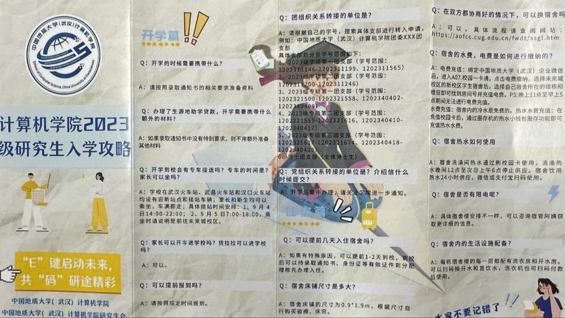 “E”键启动未来,共“码”研途精彩。为了帮助新生报到畅通无忧,学院精心制作了“beat365官方网站2023级研究生入学攻略”,攻略分为开学篇、学习篇、生活篇三部分,帮助同学们全方位了解开学时需携带的相关材料、课程培养、团组织关系转接等事项,同时一一解答关于体育馆预约、宿舍水费电费缴纳、热水使用、宿舍管理等问题,帮助新生尽快熟悉校园环境。