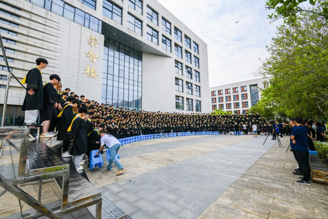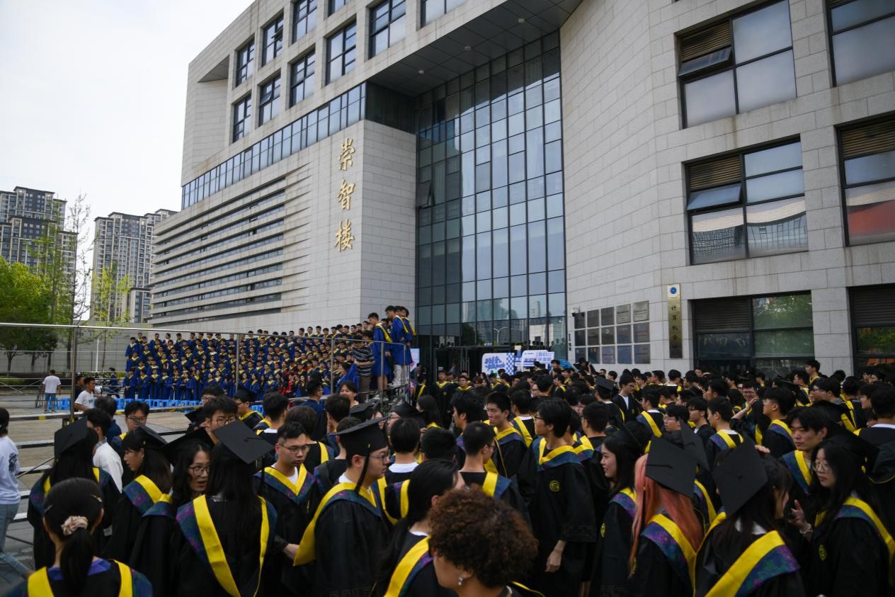 阳光正好,身着学士服在崇智楼前并肩而立