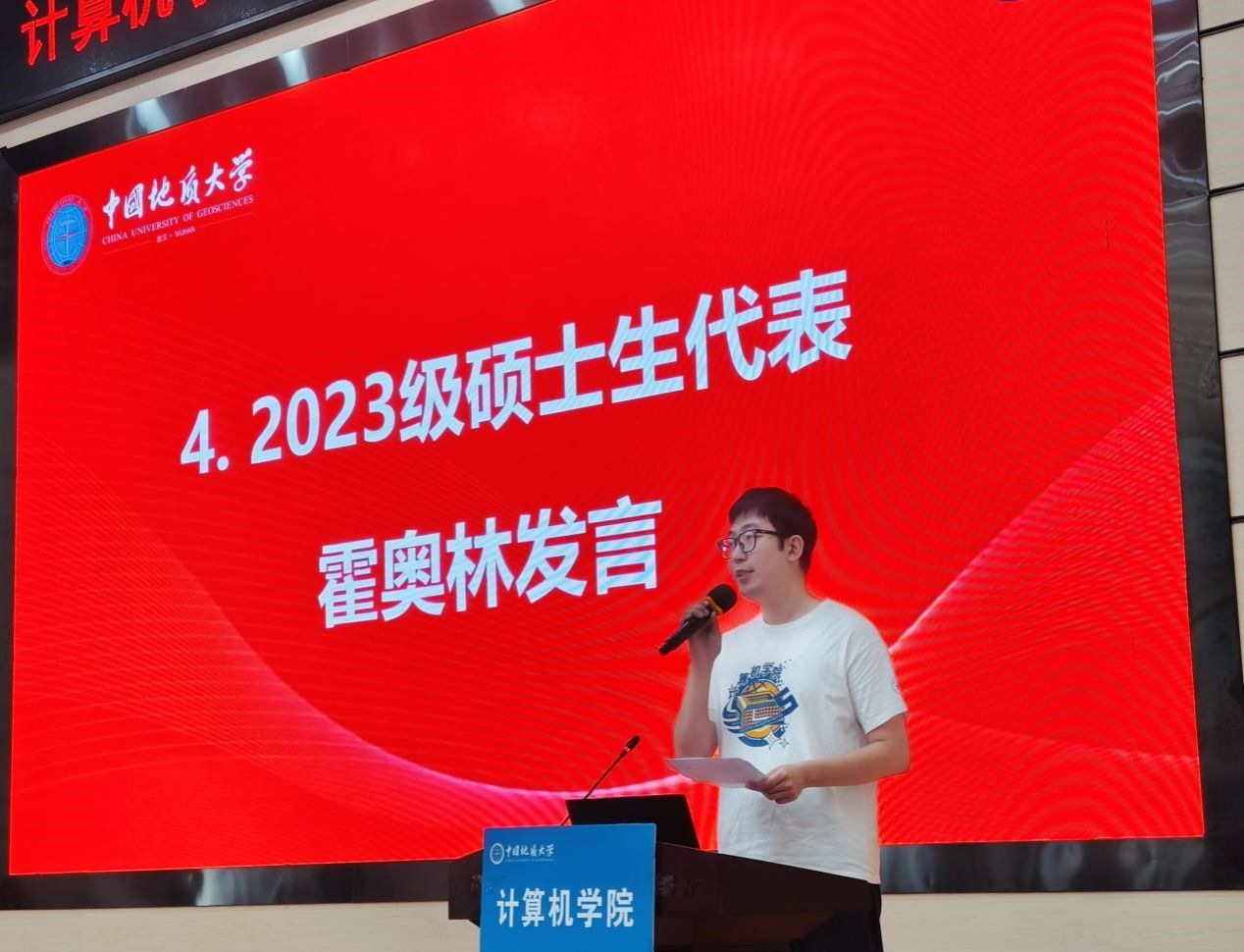 高年级学生代表、2023级硕士生霍奥林发言。他结合在校六年的学习成长经历,作了关于“不忘初心、勇于尝试、审视未来、劳逸结合”等方面的分享,鼓励新生坚定信念、把握机遇、勤于思考、全面发展,在充满活力与底蕴的beat365官方网站勇敢追梦、踏实圆梦,以实际行动书写属于自己的地大计科故事。