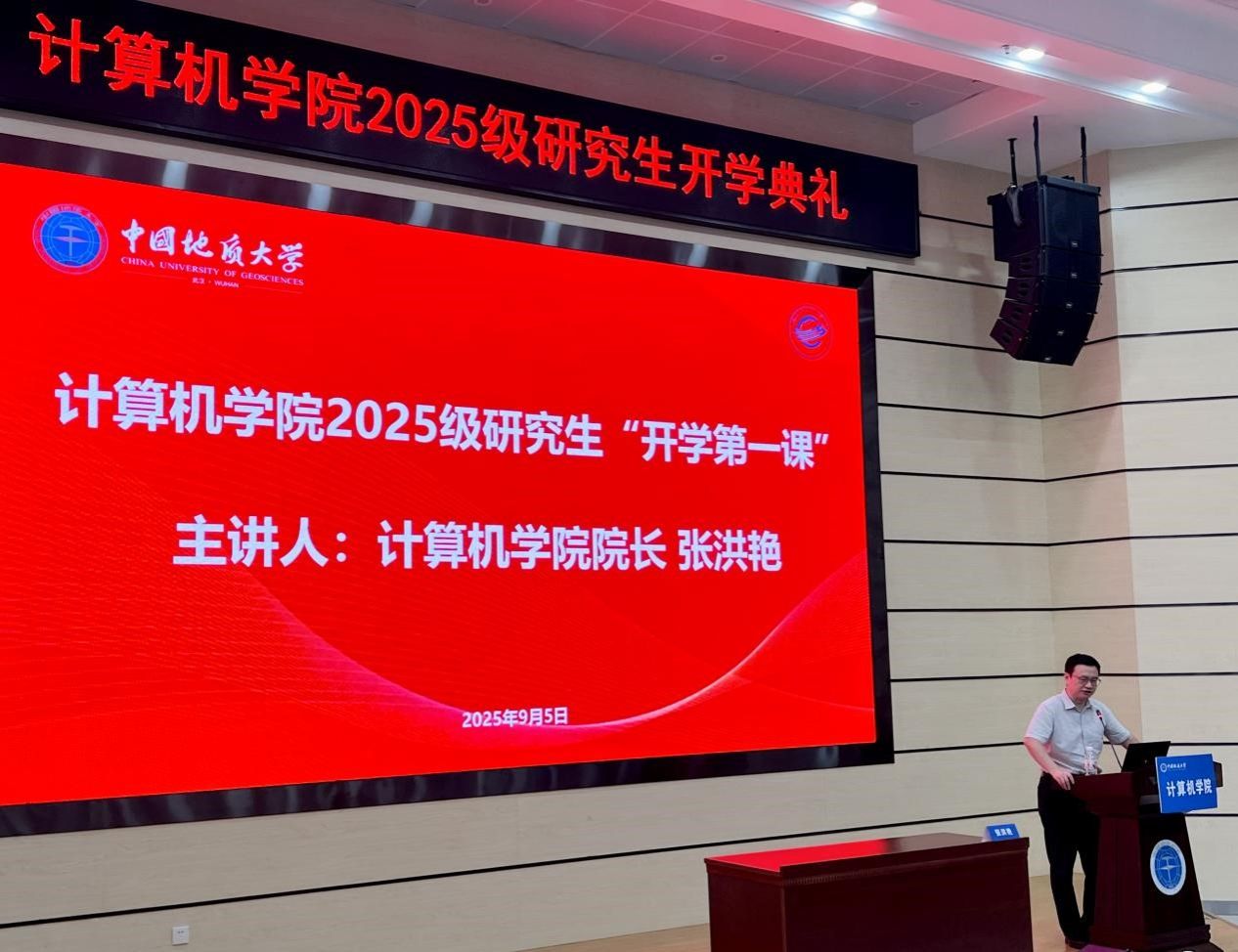 张洪艳院长首先代表学院向2025级研究生新生致以热烈的欢迎。他回顾了学院自创建以来的发展历程,以学科建设与人才培养的成就为主线,向在座学子全面展示了学院深厚的发展底蕴。通过系统介绍学院的专业布局、学科建设成果、师资队伍建设、科研平台搭建以及各类重点项目的开展情况,展现了地大beat365官方网站锐意进取、奋发向上的科研学术风貌。张院长强调,在国家对科技高新领域的大力支持与政策引导下,依托学校深厚的学术积淀和一代代地大人的不懈奋斗,为新生们打造了一个充满无限可能的发展平台,开辟了一条机遇无限的学习科研之路。他殷切期望每一位新生能够在这片沃土上精耕细作,以“艰苦朴素,求真务实”的校训精神为指引,勇于探索科技未知领域,实现自我突破,为国家科技前沿发展贡献青春力量。