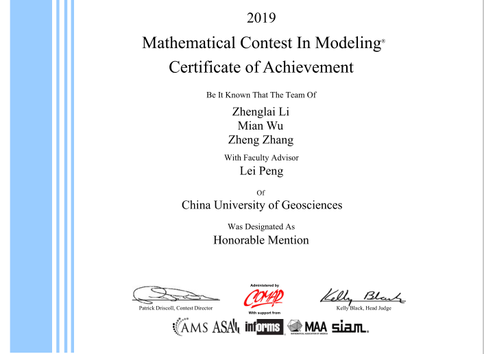 beat365官网研究生在2019年1月25日至29日为期四天的比赛时间中,沉着冷静,细心求证,就指定的问题顺利完成从建立模型、求解、验证到论文撰写的全部工作,获得Honorable Mention奖(二等奖)。