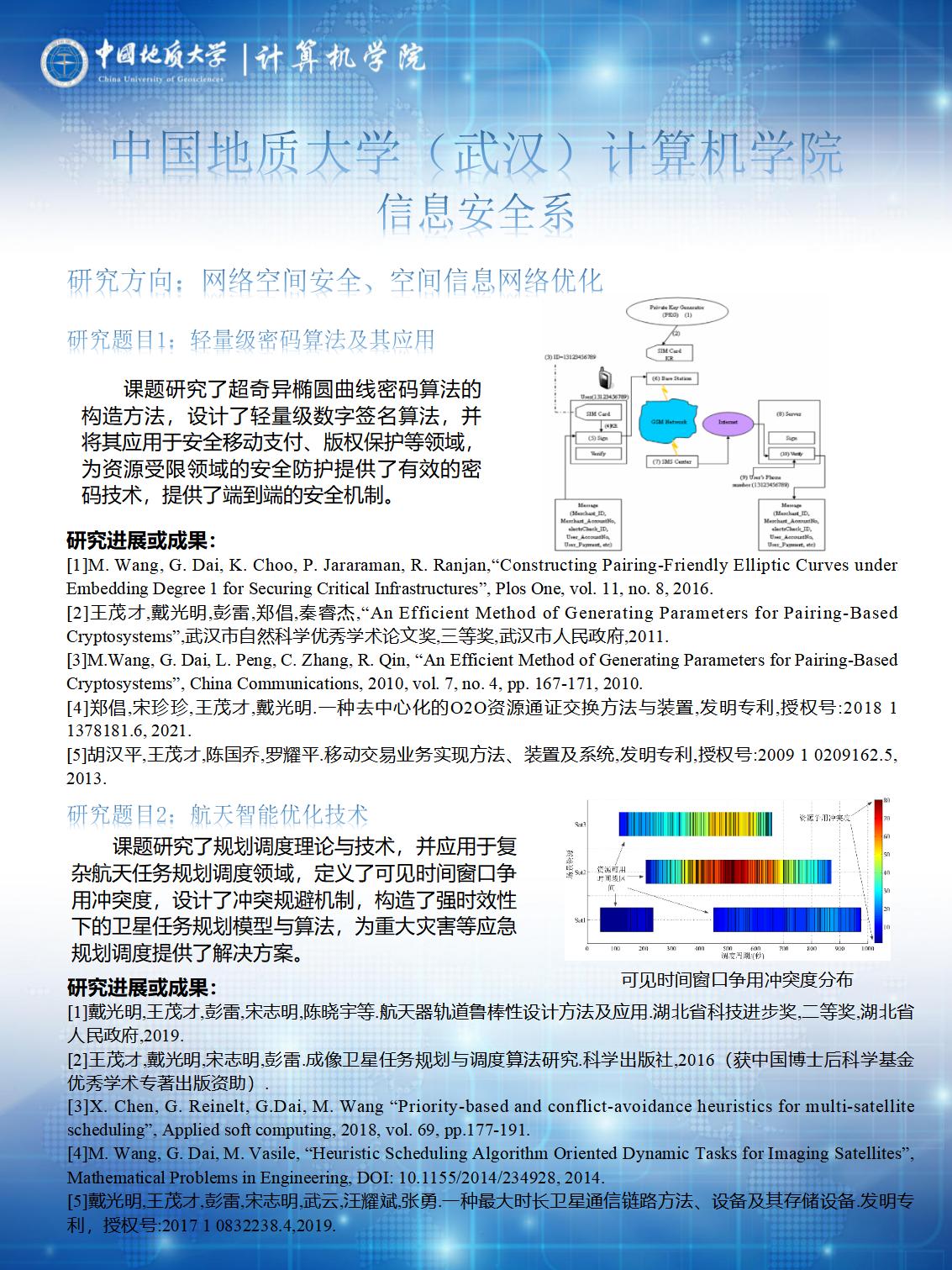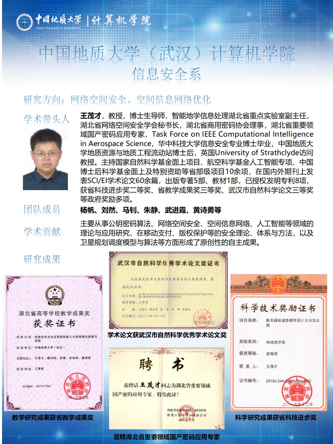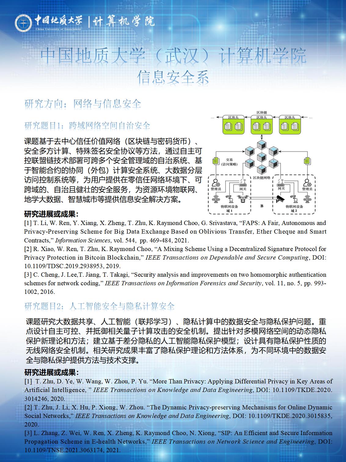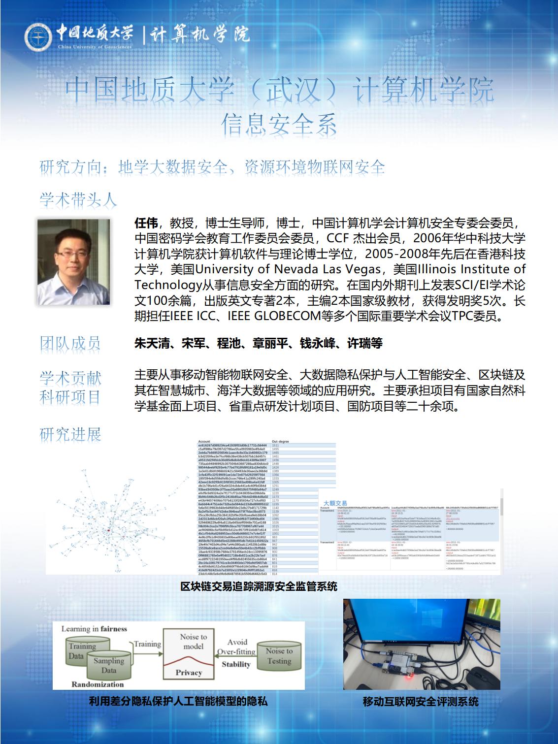 主要从事网络与信息安全的理论与应用研究,侧重于研究:网络空间安全、物联网安全、大数据与人工智能安全、应用密码学、区块链、隐私保护。在移动智能物联网安全,大数据隐私保护与人工智能安全,区块链及其在智慧城市、海洋大数据等领域的应用,移动支付、版权保护等的安全理论、体系与方法以及卫星规划安全调度模型与算法等方面形成特色方向。共有专任教师14人,其中学术带头人2人,学术骨干6人。近3年共承担国家和省部级等各类科研项目30项,发表学术论文80篇,出版专著7部,获得省部级以上奖励3项、国家发明专利和软件著作权37项。指导本科生、研究生在各类大赛中获得省部级以上奖项46次。