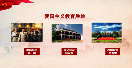 1927年8月1日,南昌起义在全国人民面前树立了一面鲜明的武装斗争旗帜,充分地表现了共产党员和中国人民不畏强敌、前仆后继的革命精神;1935年1月15日至17日,遵义会议确立了以毛泽东为代表的新的中央的正确领导,是中国共产党生死攸关的转折点,是中国共产党从幼稚走向成熟的标志;西柏坡革命圣地作为我国最具有标志性意义的五大革命圣地之一,党中央和毛主席在此指挥了震惊中外的辽沈、淮海、平津三大战役……