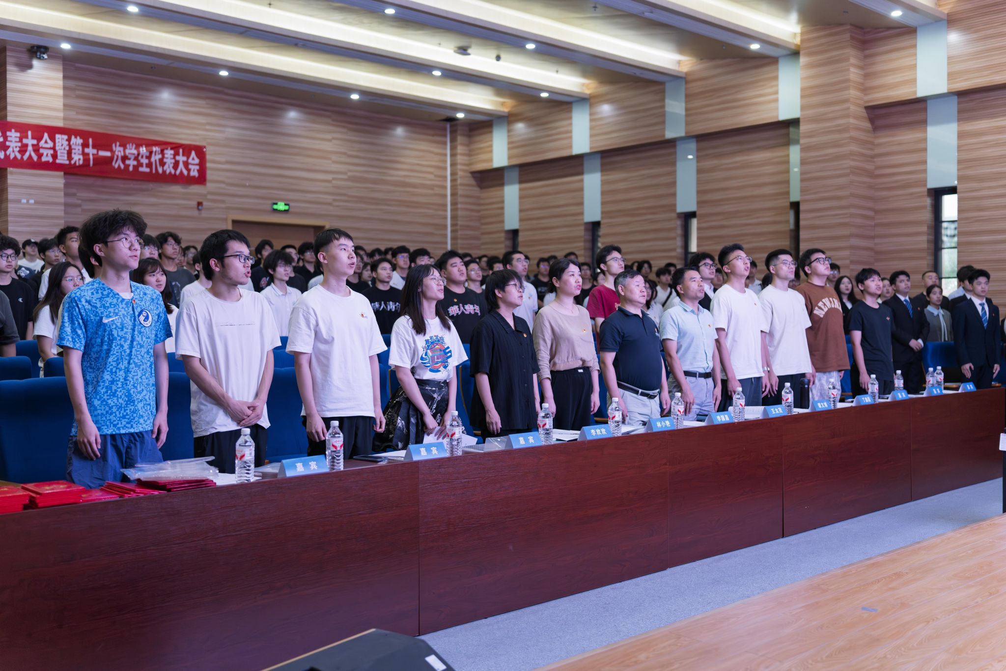 大会伊始,全体老师和学生代表起立,齐唱国歌。
