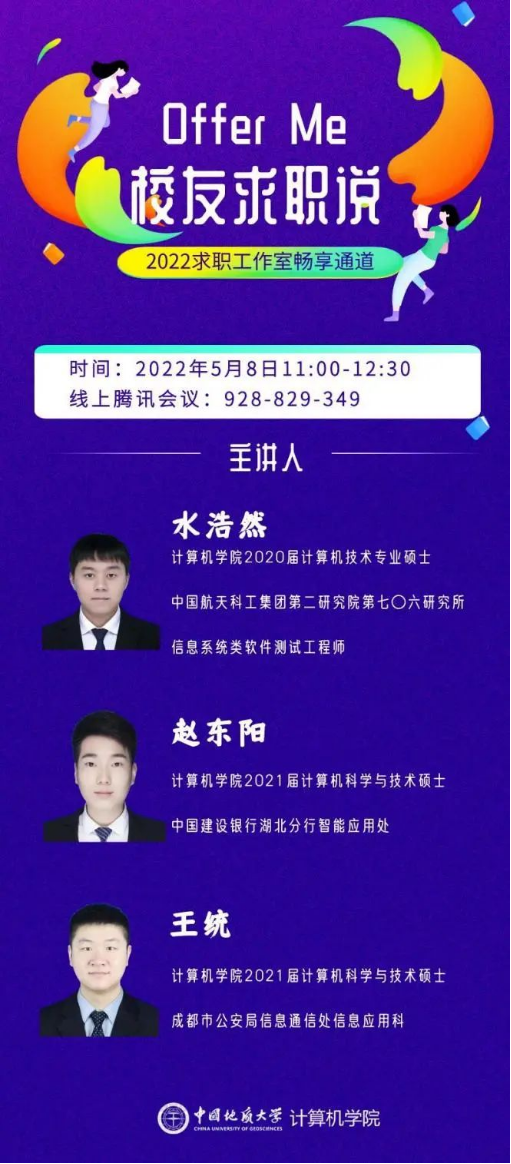 (通讯员:顾伟超)beat365官方网站“Offer Me”分享会之“校友求职说”专场活动于5月8日成功举行。本次活动邀请到3位来自不同行业的校友:2021届计算机科学与技术硕士专业毕业生赵东阳,目前就职于中国建设银行湖北分行;2020届计算机技术硕士专业毕业生水浩然,目前就职于中国航天科工集团第二研究院706所;2021届计算机科学与技术硕士专业毕业生王统,目前就职于成都市公安局,在线分享他们的职业选择、求职规划与工作感受。学院团委书记、研究生辅导员李欢欢,2019级辅导员闫维蓉以及200余名学生参与此次分享活动,李欢欢担任主持。