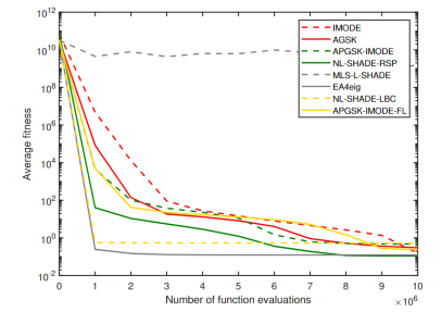 实验基于CEC 2020和CEC 2022数据集开展。实验涉及到7个现存的优秀算法。经过实验验证,该算法显著优于现有的适用于新规则的各种算法,表现很有竞争力。收敛图说明,APGSK-IMODE-FL在执行的后期,还有很强的优化能力。(见图中的黄色实线)